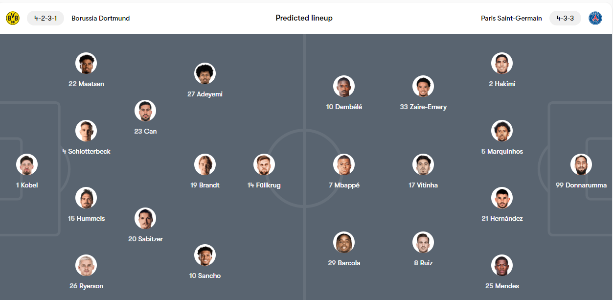 부상 및 징계 상황: 도르트문트는 유수파 무코코, 줄리안 라이어슨 등 주요 선수들의 부상으로 어려움을 겪고 있습니다. PSG 역시 부상자가 다수 발생한 가운데, 우스만 뎀벨레는 징계로 인해 출전할 수 없습니다 (TheHardTackle.com).