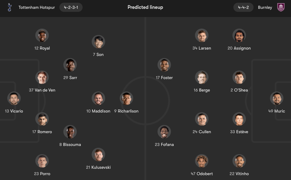 전술 설정: 이러한 도전에도 불구하고, 토트넘은 강력한 스쿼드를 4-2-3-1 포메이션으로 출전시킬 예정이며, 홈의 이점과 선수층의 깊이를 활용하여 결장 선수들을 대체할 계획입니다 (TheHardTackle.com). 반면, 번리는 토트넘의 플레이를 방해하고 역습 기회를 찾으려는 더 수비적인 4-4-2 전술을 사용할 것으로 예상됩니다 (TheHardTackle.com).